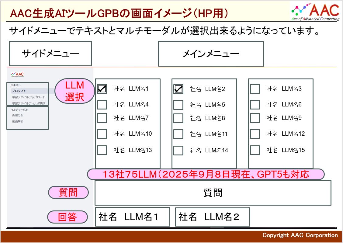 弊社生成AIツール”GPB”では、対象LLMの検証をしたり、他の
