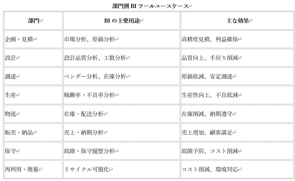 部門別各種分析業務をBIツールで行う場合のユースケース(ChatGPT5より)ですが、